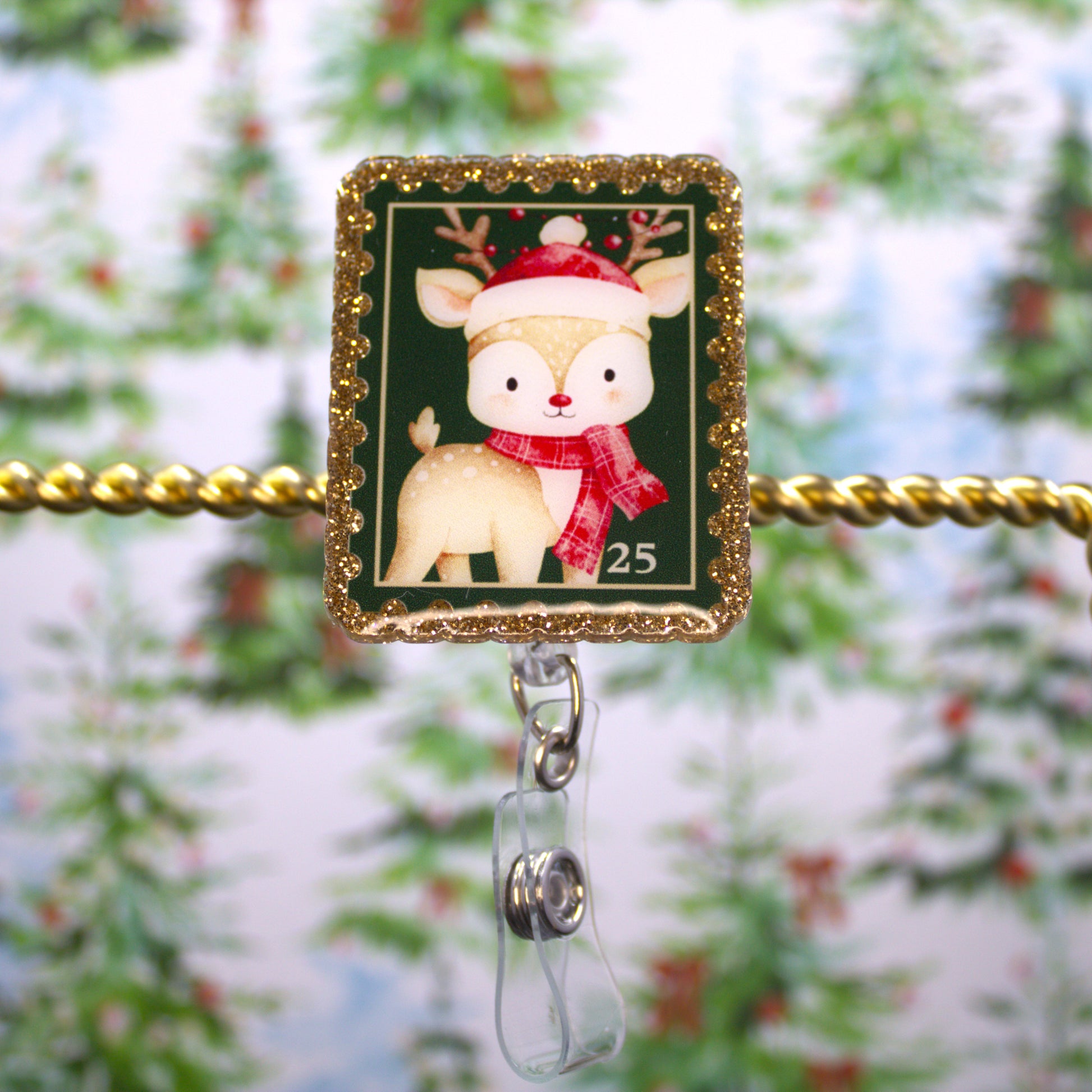 This festive reindeer postage stamp is great festive addition to your badge reel.